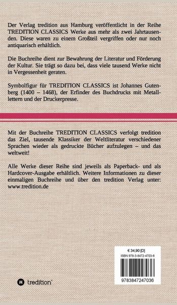 Diese Hardcover-Ausgabe ist Teil der TREDITION CLASSICS. Der Verlag tredition aus Hamburg veröffentlicht in der Buchreihe TREDITION CLASSICS Werke aus mehr als zwei Jahrtausenden. Diese waren zu einem Großteil vergriffen oder nur noch antiquarisch erhältlich. Mit TREDITION CLASSICS verfolgt tredition das Ziel, tausende Klassiker der Weltliteratur verschiedener Sprachen wieder als gedruckte Bücher zu verlegen und das weltweit! Die Buchreihe dient zur Bewahrung der Literatur und Förderung der Kultur. Sie trägt so dazu bei, dass viele tausend Werke nicht in Vergessenheit geraten.