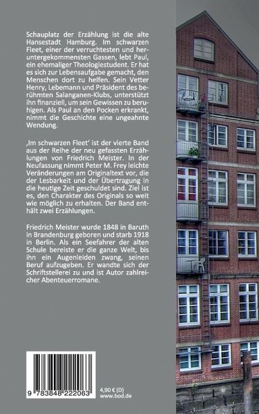 Schauplatz der Erzählung ist die alte Hansestadt Hamburg. Im schwarzen Fleet, einer der verruchtesten und heruntergekommensten Gassen, lebt Paul, ein ehemaliger Theologiestudent. Er hat es sich zur Lebensaufgabe gemacht, den Menschen dort zu helfen. Sein Vetter Henry, Lebemann und Präsident des berühmten Salanganen-Klubs, unterstützt ihn finanziell, um sein Gewissen zu beruhigen. Als Paul an den Pocken erkrankt, nimmt die Geschichte eine ungeahnte Wendung.'Im schwarzen Fleet' ist der vierte Band aus der Reihe der neu gefassten Erzählungen von Friedrich Meister. In der Neufassung nimmt Peter M. Frey leichte Veränderungen am Originaltext vor, die der Lesbarkeit und der Übertragung in die heutige Zeit geschuldet sind. Ziel ist es, den Charakter des Originals so weit wie möglich zu erhalten. Der Band enthält zwei Erzählungen.