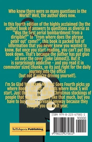 Who knew there were so many questions in the World? Well, the author does now. In this fourth edition of the highly acclaimed (by the author) book of answers to questions as diverse as "Was the first aerial bombardment from a dirigible?" to "From where does the phrase 'peter out' come?", this book is packed full of information that you never knew you wanted to know. But once you start reading, you can't put this book down. That's because the author has put glue all over the cover (joke (almost)). But it is surprisingly addictive - and you read it in commuter sized shucks, so its just right for the daily journey into the office (but not if you're driving yourself). I'm So Glad You Asked Me That Goes Fourth picks up where Book 3 left off and ends where Book 5 will start. Just the thing to fill the Christmas stockings of people that you don't really like that much, but you have to buy them a present anyway because they bought you one last year.