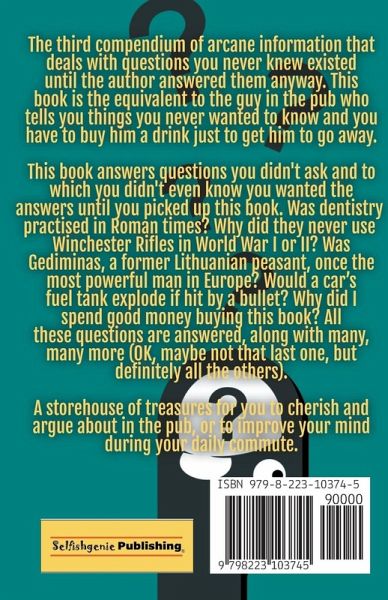 The third compendium of arcane information that deals with questions you never knew existed until the author answered them anyway. This book is the equivalent to the guy in the pub who tells you things you never wanted to know and you have to buy him a drink just to get him to go away. This book answers questions you didn't ask and to which you didn't even know you wanted the answers until you picked up this book. Was dentistry practised in Roman times? Why did they never use Winchester Rifles in World War I or II? Was Gediminas, a former Lithuanian peasant, once the most powerful man in Europe? Would a car's fuel tank explode if hit by a bullet? Why did I spend good money buying this book? All these questions are answered, along with many, many more (OK, maybe not that last one, but definitely all the others). A storehouse of treasures for you to cherish and argue about in the pub, or to improve your mind during your daily commute.