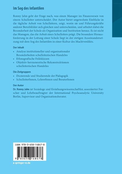 Ronny Jahn geht der Frage nach, was einen Manager im Finanzwesen von einem Schulleiter unterscheidet. Der Autor bietet ungewohnte Einblicke in die tägliche Arbeit von Schulleitern, zeigt, worin sie und Führungskräfte anderer Berufsfelder sich gleichen und unterscheiden und arbeitet dabei die Besonderheit der Schule als Organisation und Institution heraus. Es ist nicht das Managen, das die Arbeit eines Schulleiters prägt. Die besondere Herausforderung in der Leitung einer Schule liegt in der stetigen Auseinandersetzung mit dem Sog des Infantilen in einer Kultur des Machtverdikts.