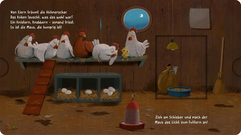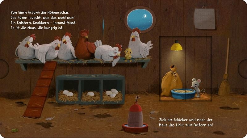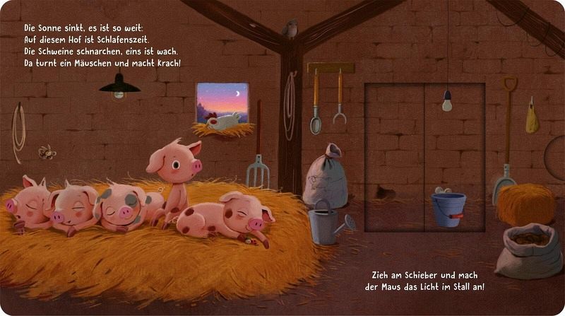 Wenn auf dem Bauernhof langsam die Sonne untergeht, wird es Zeit zum Schlafen - doch eine kleine Maus ist noch hellwach! Sie turnt, hat Durst oder muss noch schnell aufs Klo. Seite für Seite können Kinder mit den Schiebe-Elementen das Licht an- und ausmachen und den Tieren beim Einschlafen helfen. Die lustigen Reime und die stimmungsvollen Illustrationen machen dieses Mitmachbuch zu einer wertvollen Einschlafhilfe und zu einem Lieblingsbuch für die abendlichen Einschlaf-Rituale.