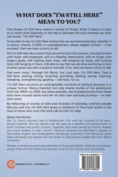 The phrase I'm Still Here means a variety of things. What it means to each of us most often depends on the day or perhaps the very moment we say, "I'm Still Here." To be able to say I'm Still Here means that we survived yesterday: whether it is cancer, chemo, COVID, or unemployment, abuse, neglect or loss - if we survived, then we have a story to tell. Yet I'm Still Here also means that we are living in the present, moving forward with hope: still employed, still in a healthy relationship, still on target with today's goals, still making ends meet, still keeping up hope, still trusting God, still hanging in there, still able to say that we are alive and living to face another great day with a positive attitude. If so, then we have a story to tell. And even more, through His Word, the Lord says, I'm Still Here. God is still here: waiting, loving, forgiving, providing, healing, saving, inspiring, revealing, strengthening, guiding - still here, for us. I'm Still Here recounts an unforgettable narrative of spiritual journeys in a unique format. Author, Nancy Hulshult, not only shares stories of her adventures from the 1960's to 2020, but when possible, she includes stories from those who have crossed path with her on their own spiritual journeys - in their own voice. By reflecting on stories of faith and miracles of everyday, ordinary people like you and I, I'm Still Here gives us evidence of how God works in the lives of those who trust Him and call on Him for help.