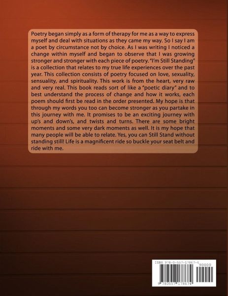 "I'm Still Standing" is a collection that relates to my true life experiences over the past year. This collection consists of poetry focused on love, sexuality, sensuality, and spirituality. This work is from the heart, very raw and very real. This book reads sort of like a "poetic diary" and to best understand the process of change and how it works, each poem should first be read in the order presented. My hope is that through my words you too can become stronger as you partake in this journey with me. It promises to be an exciting journey with up's and down's, and twists and turns. There are some bright moments and some very dark moments as well. It is my hope that many people will be able to relate. Yes, you can Still Stand without standing still! Life is a magnificent ride so buckle your seat belt and ride with me.