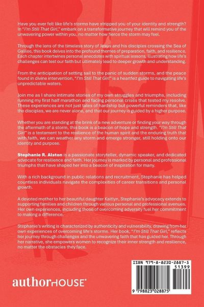 Have you ever felt like life's storms have stripped you of your identity and strength? In "I'm Still That Girl," embark on a transformative journey that will remind you of the unwavering power within you, no matter how fierce the storm may feel. Through the lens of the timeless story of Jesus and his disciples crossing the Sea of Galilee, this book delves into the profound themes of preparation, faith, and resilience. Each chapter intertwines personal anecdotes with spiritual lessons, illustrating how life's challenges can test our faith but ultimately lead to deeper growth and understanding. From the anticipation of setting sail to the panic of sudden storms, and the peace found in divine intervention, "I'm Still That Girl" is a heartfelt guide to navigating life's unpredictable waters. Join me as I share intimate stories of my own struggles and triumphs, including running my first half marathon and facing personal crises that tested my resolve. These experiences are not just tales of hardship but powerful reminders that, like the disciples, we are never alone, and that our journey is guided by a higher purpose. Whether you are standing at the brink of a new adventure or finding your way through the aftermath of a storm, this book is a beacon of hope and strength. "I'm Still That Girl" is a testament to the resilience of the human spirit and the enduring truth that with faith, we can weather any storm and emerge stronger, still holding onto our identity and purpose.