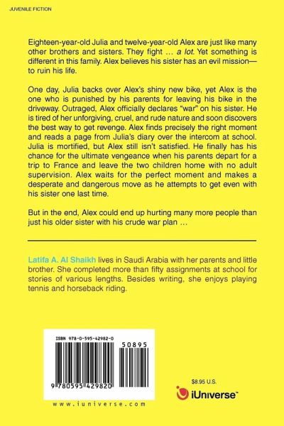 Eighteen-year-old Julia and twelve-year-old Alex are just like many other brothers and sisters. They fight . a lot. Yet something is different in this family. Alex believes his sister has an evil mission-to ruin his life. One day, Julia backs over Alex's shiny new bike, yet Alex is the one who is punished by his parents for leaving his bike in the driveway. Outraged, Alex officially declares "war" on his sister. He is tired of her unforgiving, cruel, and rude nature and soon discovers the best way to get revenge. Alex finds precisely the right moment and reads a page from Julia's diary over the intercom at school. Julia is mortified, but Alex still isn't satisfied. He finally has his chance for the ultimate vengeance when his parents depart for a trip to France and leave the two children home with no adult supervision. Alex waits for the perfect moment and makes a desperate and dangerous move as he attempts to get even with his sister one last time. But in the end, Alex could end up hurting many more people than just his older sister with his crude war plan .