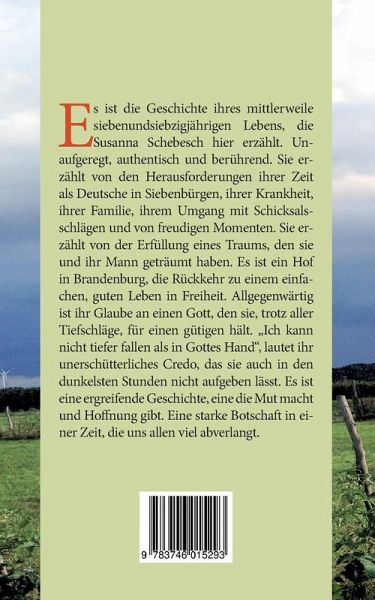 Es ist die Geschichte ihres mittlerweile siebenundsiebzigjährigen Lebens, die Susanna Schebesch hier erzählt. Unaufgeregt, authentisch und berührend. Sie erzählt von den Herausforderungen ihrer Zeit als Deutsche in Siebenbürgen, ihrer Krankheit, ihrer Familie, ihrem Umgang mit Schicksalsschlägen und von freudigen Momenten. Sie erzählt von der Erfüllung eines Traums, den sie und ihr Mann geträumt haben. Es ist ein Hof in Brandenburg, die Rückkehr zu einem einfachen, guten Leben in Freiheit. Allgegenwärtig ist ihr Glaube an einen Gott, den sie, trotz aller Tiefschläge, für einen gütigen hält. Ich kann nicht tiefer fallen als in Gottes Hand, lautet ihr unerschütterliches Credo, das sie auch in den dunkelsten Stunden nicht aufgeben lässt. Es ist eine ergreifende Geschichte, eine die Mut macht und Hoffnung gibt. Eine starke Botschaft in einer Zeit, die uns allen viel abverlangt.
