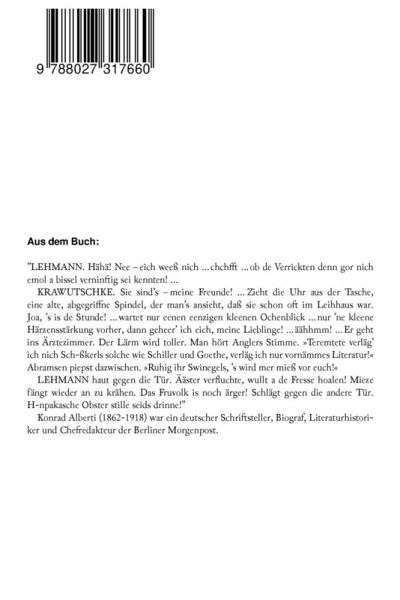 Aus dem Buch: "LEHMANN. Hähä! Nee - eich weeß nich ... chchfft ... ob de Verrickten denn gor nich emol a bissel verninftig sei kennten! ... KRAWUTSCHKE. Sie sind's - meine Freunde! ... Zieht die Uhr aus der Tasche, eine alte, abgegriffne Spindel, der man's ansieht, daß sie schon oft im Leihhaus war. Joa, 's is de Stunde! ... wartet nur eenen eenzigen kleenen Ochenblick ... nur 'ne kleene Härzensstärkung vorher, dann geheer' ich eich, meine Lieblinge! ... äähhmm! ... Er geht ins Ärztezimmer. Der Lärm wird toller. Man hört Anglers Stimme. Teremtete verläg' ich nich Sch-ßkerls solche wie Schiller und Goethe, verläg ich nur vornämmes Literatur! Abramsen piepst dazwischen. Ruhig ihr Swinegels, 's wird mer mieß vor euch! LEHMANN haut gegen die Tür. Ääster verfluchte, wullt a de Fresse hoalen! Mieze fängt wieder an zu krähen. Das Fruvolk is noch ärger! Schlägt gegen die andere Tür. H-npakasche Obster stille seids drinne!" Konrad Alberti (1862-1918) war ein deutscher Schriftsteller, Biograf, Literaturhistoriker und Chefredakteur der Berliner Morgenpost.