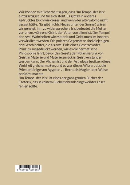 Wir können mit Sicherheit sagen, dass "Im Tempel der Isis" einzigartig ist und für sich steht. Es gibt kein anderes gedrucktes Buch wie dieses, und wenn der alte Salomo nicht gesagt hätte: "Es gibt nichts Neues unter der Sonne", wären wir geneigt, ihm zu widersprechen. Isis bedeutet die Mutter von allem, während Osiris der Vater von allem ist. Der Tempel der zwei Wahrheiten wie Materie und Geist muss im Inneren verwirklicht werden. Die polaren Gegensätze sind diejenigen der Geschlechter, die als zwei Pole eines Gesetzes oder Prinzips ausgedrückt werden, wie es die hermetische Philosophie lehrt, bevor das Gesetz der Polarisierung von Geist in Materie und Materie zurück in Geist verstanden werden kann. Der Alchemist und der Astrologe besitzen diese Weisheit gleichermaßen, und es war dieses Wissen, das die Priesterkönige von Ägypten zu Recht als Magier oder Weise berühmt machte. "Im Tempel der Isis" ist eines der ganz großen Bücher der Esoterik, das in keinem Bücherschrank eingeweihter Leser fehlen sollte.