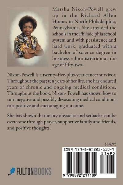 Marsha Nixon-Powell grew up in the Richard Allen Homes in North Philadelphia, Pennsylvania. She attended the schools in the Philadelphia school system and with persistence and hard work, graduated with a bachelor of science degree in business administration at the age of fifty-two. Nixon-Powell is a twenty-five-plus-year cancer survivor. Throughout the past ten years of her life, she has endured years of chronic and ongoing medical conditions. Throughout the book, Nixon- Powell has shown how to turn negative and possibly devastating medical conditions to a positive and encouraging outcome. She has shown that many obstacles and setbacks can be overcome through prayer, supportive family and friends, and positive thoughts.