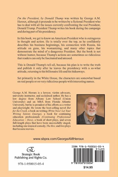 I'm the President, by Donald Thump was written by George A.M. Heroux, although it pretends to be written by a fictional President who has to deal with all the issues currently confronting the real President, Donald Trump. President Thump writes his book during the campaign and during part of his presidency. In this book, we get to know an American President who is outrageous in thought and action. He is totally over the top, as he confidently describes his business beginnings, his connection with Russia, his attitude on guns, his womanizing, and many other topics that demonstrate the mind of a dangerous President. But the book is not without humor, because Thump's actions are sometimes so ridiculous that readers can only be fascinated and amused. This is Donald Thump's tell-all, because his plan is to write the truth and publish it only after he leaves the presidency with a so-what attitude, returning to his billionaire life and his hideaways. Set primarily in the White House, the characters are somewhat based on real people or on very ridiculous people with interesting names. George A.M. Heroux is a lawyer, victim advocate, university instructor, and acclaimed author. He has a law degree from Albany Law School (Union University) and an MBA from Florida Atlantic University, but he is proudest of his efforts as a writer and playwright. He wrote the best-selling novel But for the Crash, a book on writing (Write Now! Let Your Writing Talents Emerge), a book for continuing education professionals (Continuing Professional Education - How), a book of short plays, and seven full-length plays that have been successfully staged, including one musical comedy, The Rev, and two plays that became movies.