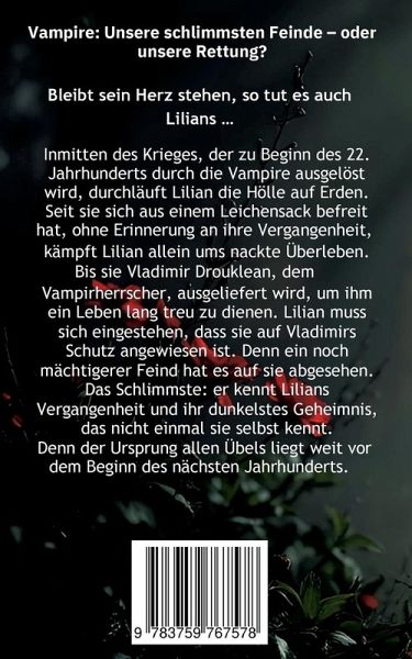 Vampire: unsere schlimmsten Feinde - oder unsere Rettung? Bleibt sein Herz stehen, so tut es auch Lilians... Inmitten des Krieges, der zu Beginn des 22. Jahrhunderts durch die Vampire ausgelöst wird, durchläuft Lilian die Hölle auf Erden. Seit sie sich aus einem Leichensack befreit hat, ohne Erinnerung an ihre Vergangenheit, kämpft Lilian allein ums nackte Überleben. Bis sie Vladimir Drouklean, dem Vampirherrscher, ausgeliefert wird, um ihm ein Leben lang treu zu dienen. Lilian muss sich eingestehen, dass sie auf Vladimirs Schutz angewiesen ist. Denn ein noch mächtigerer Feind hat es auf sie abgesehen. Das Schlimmste: er kennt Lilians Vergangenheit und ihr dunkelstes Geheimnis, das nicht einmal sie selbst kennt. Denn der Ursprung allen Übels liegt weit vor Beginn des nächsten Jahrhunderts.