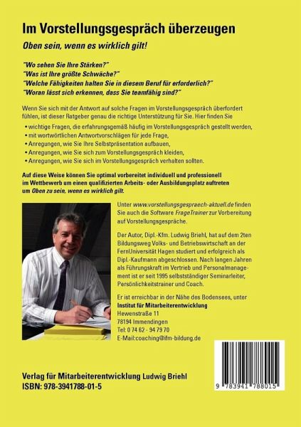 ¿Wo liegen Ihre Schwächen?¿, ¿Weshalb sollten wir gerade Sie einstellen?¿, ¿Welche Fähigkeiten halten Sie in dieser Funktion für erforderlich?¿, ¿Woran lässt sich erkennen, dass Sie teamfähig sind?¿ Wer sich im Vorstellungsgespräch mit der Antwort auf diese Fragen überfordert fühlt, findet in diesem Ratgeber genau die richtige Unterstützung. In dem Ratgeber finden Sie wichtige Fragen, die erfahrungsgemäß häufig im Vorstellungsgespräch gestellt werden mit wortwörtlichen Antwortvorschlägen für jede Frage. Weiterhin finden Sie Anregungen, ¿ wie Sie auf unerlaubte Fragen antworten können, ¿ wie Sie auch in Stressinterviews souverän reagieren, ¿ wie Sie Gehaltsverhandlungen erfolgreich führen, ¿ wie Sie Ihre Selbstpräsentation aufbauen, ¿ wie Sie sich zum Vorstellungsgespräch kleiden und ¿ wie Sie sich im Vorstellungsgespräch verhalten.