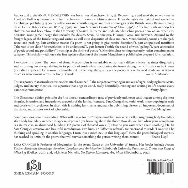 Born near Manchester in 1948, Anna Mendelssohn authored poetry, fiction, drama, and life writing; she was also a visual artist, musician, and translator. From 1971 to 1977 she served time at Holloway Prison in London due to her involvement in extreme leftist activism. From the early 1980s, Mendelssohn composed nineteen poetry collections and published in journals receptive to her experimental, charged lyrics, among them, Parataxis, Critical Quarterly, and Jacket. Her work appeared in seminal anthologies including Denise Riley's Poets on Writing (1992), Iain Sinclair's Conductors of Chaos (1996), and Rod Mengham and John Kinsella's Vanishing Points: New Modernist Poems (2004). Often situated within the British Poetry Revival, Mendelssohn retained a marginal, if constant, presence in the poetry community in Cambridge, England, where she lived from 1983 until her death in 2009. In 2010, her vast archive of writings and drawings was generously donated by her three children to Special Collections at the University of Sussex. Labelled surrealist and ludic, Mendelssohn's poems draw thematically and stylistically on an expansive lineage that encompasses an international array of post-1850 avant-garde figures such as Charles Baudelaire, Gertrude Stein, Anna Ahkmatova, Nâzim Hikmet, Federico García Lorca, and Tom Raworth. Closely attuned to the fraught legacy of the female vanguard writer, as well as to disparities of class and race, her poems are impassioned, acute, probing, allusive, and unparalleled. Part aesthetic treatise ("a poem is not going to give precise directions"); part antipolitical manifesto ("the war is too close / for revolution to be understood"); part lament ("softly the sound of woe / gallops"); part celebration of the possibilities of poetic noise and possibility, replete with "scoopydoo sounds", "night[s of] pouring gold", and "high walk[s] into fantasy", Mendelssohn's writing resolutely resists containment or category. This scholarly edition is the first replete collection of the poems Anna Mendelssohn published or prepared for circulation in her lifetime, often writing under the name Grace Lake.
