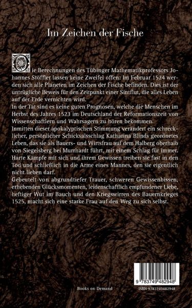 Die Berechnungen des Tübinger Mathematikprofessors Johannes Stöffler lassen keine Zweifel offen: Im Februar 1524 werden sich alle Planeten im Zeichen der Fische befinden. Dies ist der untrügliche Beweis für den Zeitpunkt einer Sintflut, die alles Leben auf der Erde vernichten wird.In der Tat sind es keine guten Prognosen, welche die Menschen im Herbst des Jahres 1523 im Deutschland der Reformationszeit von Wissenschaftlern und Wahrsagern zu hören bekommen. Inmitten dieser apokalyptischen Stimmung verändert ein schrecklicher, persönlicher Schicksalsschlag Katharina Blinds geordnetes Leben, das sie als Bauers- und Wirtsfrau auf dem Halberg oberhalb von Siegelsberg bei Murrhardt führt, mit einem Schlag für immer. Harte Kämpfe mit sich und ihrem Gewissen treiben sie fast in den Tod und schließlich in die Arme eines Mannes, den sie eigentlich nicht lieben darf. Gebeutelt von abgrundtiefer Trauer, schweren Gewissenbissen, erhebenden Glücksmomenten, leidenschaftlich empfundener Liebe, heftiger Wut im Bauch und den Kriegswirren des Bauernkrieges 1525, macht sich eine starke Frau auf den Weg zu sich selbst.