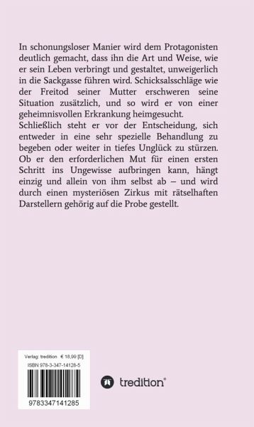 In schonungsloser Manier wird dem Protagonisten deutlich gemacht, dass ihn die Art und Weise, wie er sein Leben verbringt und gestaltet, unweigerlich in die Sackgasse führen wird. Schicksalsschläge wie der Freitod seiner Mutter erschweren seine Situation zusätzlich, und so wird er von einer geheimnisvollen Erkrankung heimgesucht. Schließlich steht er vor der Entscheidung, sich entweder in eine sehr spezielle Behandlung zu begeben oder weiter in tiefes Unglück zu stürzen. Ob er den erforderlichen Mut für einen ersten Schritt ins Ungewisse aufbringen kann, hängt einzig und allein von ihm selbst ab - und wird durch einen mysteriösen Zirkus mit rätselhaften Darstellern gehörig auf die Probe gestellt.