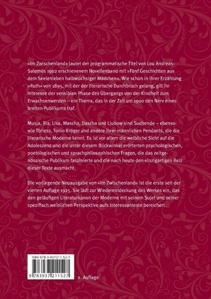 »Im Zwischenland« lautet der programmatische Titel von Lou Andreas-Salomés 1902 erschienenem Novellenband mit »Fünf Geschichten aus dem Seelenleben halbwüchsiger Mädchen«. Wie schon in ihrer Erzählung »Ruth« von 1895, mit der der literarische Durchbruch gelang, gilt ihr Interesse der sensiblen Phase des Übergangs von der Kindheit zum Erwachsenwerden: ein Thema, das in der Zeit um 1900 den Nerv eines breiten Publikums traf. Musja, Ria, Lisa, Mascha, Dascha und Ljubow sind Suchende ebensowie Törless, Tonio Kröger und andere ihrer männlichen Pendants, die die literarische Moderne kennt. Es ist vor allem die weibliche Sicht auf die Adoleszenz und die unter diesem Blickwinkel erörterten psychologischen, poetologischen und sprachphilosophischen Fragen, die das zeitgenössische Publikum faszinierte und die noch heute den einzigartigen Reiz dieser Texte ausmacht. Die vorliegende Neuausgabe von »Im Zwischenland« ist die erste seit der vierten Auflage 1925. Sie lädt zur Wiederentdeckung des Werkes ein, das den geläufigen Literaturkanon der Moderne mit seinem Sujet und seiner spezifisch weiblichen Perspektive aufs Interessanteste bereichert.