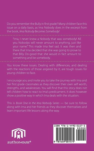 Do you remember the Bully in first grade? Many children face this issue on a daily basis, as Ima Nobody does in the excerpt from the book, Ima Nobody Becomes Somebody! "Ima, I never knew a Nobody that was somebody! All you Nobodys will never amount to anything, just like your name." This made Ima feel sad. It was then and there that Ima decided that she was going to prove to that Billy Do-good that she would in fact amount to something and be somebody. You know these issues. Dealing with differences, and dealing with the reactions of those angered by it, are tough issues for young children to face. I encourage you and invite you to take the journey with Ima and her first grade classmates as they discover their own self worth, strengths, and weaknesses. You will find that this story does not tell children how to react to Ima's predicament. It does however show a positive way in which Ima deals with the situation. This is Book One in the Ima Nobody Series - be sure to follow along with Ima and her friends as they discover themselves and learn important life lessons along the way.