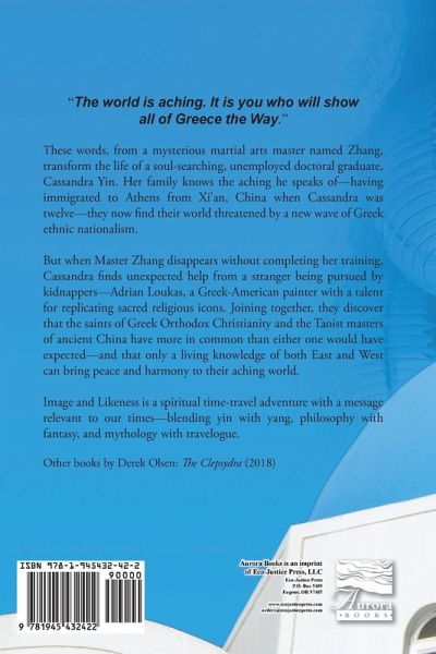 "The world is aching. It is you who will show all of Greece the Way." These words, from a mysterious martial arts master named Zhang, transform the life of a soul-searching, unemployed doctoral graduate, Cassandra Yin. Her family knows the aching he speaks of-having immigrated to Athens from Xi'an, China when Cassandra was twelve-they now find their world threatened by a new wave of Greek ethnic nationalism. But when Master Zhang disappears without completing her training, Cassandra finds unexpected help from a stranger being pursued by kidnappers-Adrian Loukas, a Greek-American painter with a talent for replicating sacred religious icons. Joining together, they discover that the saints of Greek Orthodox Christianity and the Taoist masters of ancient China have more in common than either one would have expected-and that only a living knowledge of both East and West can bring peace and harmony to their aching world. Image and Likeness is a spiritual time-travel adventure with a message relevant to our times-blending yin with yang, philosophy with fantasy, and mythology with travelogue. Other books by Derek Olsen: The Clepsydra (2018)