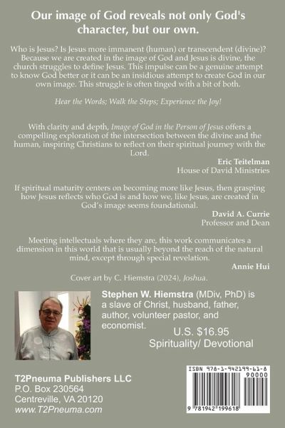 Our image of God reveals not only God's character, but our own. Who is Jesus? Is Jesus more immanent (human) or transcendent (divine)? Because we are created in the image of God and Jesus is divine, the church struggles to define Jesus. This impulse can be a genuine attempt to know God better or it can be an insidious attempt to create God in our own image. This struggle is often tinged with a bit of both. The Letter to the Church at Thessalonica was likely the first book written in the New Testament. In a literary sense, the implication is that the Apostle Paul is the father of the New Testament. Paul only knew the Risen Christ and, for him, the divinity of Christ was obvious. By contrast, the Gospels that record the humanity of Christ were written almost a generation later. Thus, the transcendence problem facing postmodern people that fixates on the humanity of Christ is relatively new. My recent book, Image and Illumination (2023), asked the question-What does it mean to be created in the image of God?- focused on Christian anthropology. Embedded in this question is the metaphysical question: Who is God? The New Testament addresses this question with three pictures of God: The person of Jesus, Jesus' teaching about God the Father in the parables, and the founding of the church on Pentecost by the Holy Spirit. In this book, I focus on the Image of God in the Person of Jesus. Hear the Words; Walk the Steps; Experience the Joy!