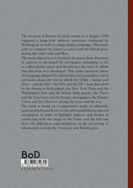 The invasion of Kuwait by Iraqi troops on 2 August 1990 triggered a large-scale military operation conducted by Washington as well as a huge media campaign. This study seeks to compare the American press with the British press during the Gulf Crisis and War. The main objective is to examine the journalistic discourse of opinion as developed by newspapers belonging to the so-called quality press and deconstruct the ways in which this discourse was developed. This raises questions about the language adopted by editorialists and journalists and in particular about the way in which the Other - enemy and allies - and the Self - the USA and the UK - were described by the American daily papers, the New York Times and the Washington Post and the British daily papers, the Times and the Guardian and the Sunday newspapers, the Sunday Times and the Observer during the crisis and the war. The study is based on a comparative analysis of editorials, opinion articles and letters to the editor published in the selected newspapers in order to highlight subjects and themes in connection with the image of the Other and the Self and show the differences and similarities in the processing of information in both the American and British press.
