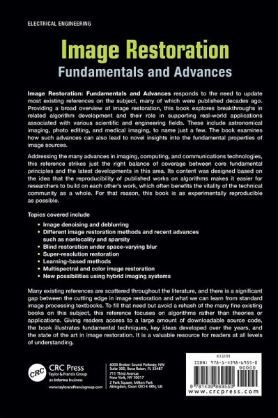 Image Restoration: Fundamentals and Advances responds to the need to update most existing references on the subject, many of which were published decades ago. Providing a broad overview of image restoration, this book explores breakthroughs in related algorithm development and their role in supporting real-world applications associated with various scientific and engineering fields. These include astronomical imaging, photo editing, and medical imaging, to name just a few. The book examines how such advances can also lead to novel insights into the fundamental properties of image sources. Addressing the many advances in imaging, computing, and communications technologies, this reference strikes just the right balance of coverage between core fundamental principles and the latest developments in this area. Its content was designed based on the idea that the reproducibility of published works on algorithms makes it easier for researchers to build on each other's work, which often benefits the vitality of the technical community as a whole. For that reason, this book is as experimentally reproducible as possible. Topics covered include: Image denoising and deblurring Different image restoration methods and recent advances such as nonlocality and sparsity Blind restoration under space-varying blur Super-resolution restoration Learning-based methods Multi-spectral and color image restoration New possibilities using hybrid imaging systems Many existing references are scattered throughout the literature, and there is a significant gap between the cutting edge in image restoration and what we can learn from standard image processing textbooks. To fill that need but avoid a rehash of the many fine existing books on this subject, this reference focuses on algorithms rather than theories or applications. Giving readers access to a large amount of downloadable source code, the book illustrates fundamental techniques, key ideas developed over the years, and the state of the art in image restoration. It is a valuable resource for readers at all levels of understanding.