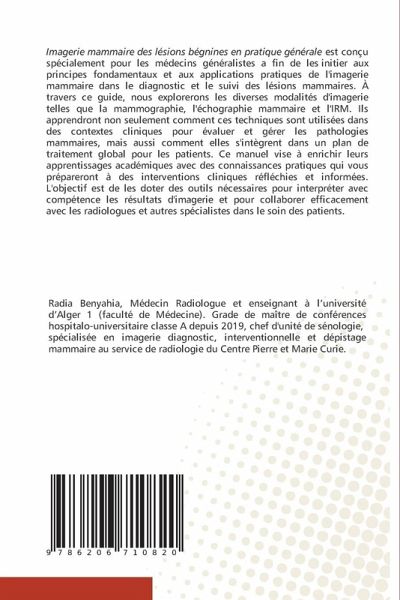 Imagerie mammaire des lésions bégnines en pratique générale est conçu spécialement pour les médecins généralistes a fin de les initier aux principes fondamentaux et aux applications pratiques de l'imagerie mammaire dans le diagnostic et le suivi des lésions mammaires. À travers ce guide, nous explorerons les diverses modalités d'imagerie telles que la mammographie, l'échographie mammaire et l'IRM. Ils apprendront non seulement comment ces techniques sont utilisées dans des contextes cliniques pour évaluer et gérer les pathologies mammaires, mais aussi comment elles s'intègrent dans un plan de traitement global pour les patients. Ce manuel vise à enrichir leurs apprentissages académiques avec des connaissances pratiques qui vous prépareront à des interventions cliniques réfléchies et informées. L'objectif est de les doter des outils nécessaires pour interpréter avec compétence les résultats d'imagerie et pour collaborer efficacement avec les radiologues et autres spécialistes dans le soin des patients.