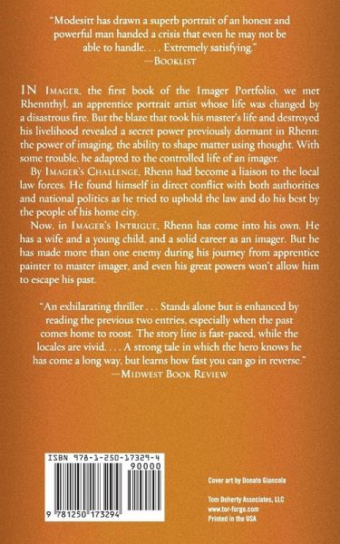 The Imager Porfolio is a bestselling and innovative epic fantasy series from L. E. Modesitt, Jr. that RT Book Reviews says "shines with engrossing characters, terrific plotting, and realistic world-building." Continue the journey with Imager's Intrigue. Rhenn has a wife and a young child, and a solid career as an imager. But he has made more than one enemy during his journey from apprentice painter to master imager, and even his great powers won't allow him to escape his past. The Imager Portfolio #1 Imager / #2 Imager's Challenge / #3 Imager's Intrigue / #4 Scholar / #5 Princeps / #6 Imager's Battalion / #7 Antiagon Fire / #8 Rex Regis / #9 Madness in Solidar / #10 Treachery's Tools / #11 Assassin's Price/#12 Endgames Other series by this author: The Saga of Recluce The Corean Chronicles The Spellsong Cycle The Ghost Books The Ecolitan Matter