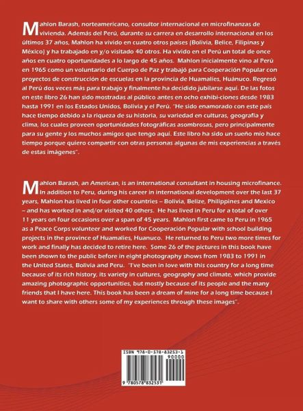 Through black-and-white photographs, "Images of Peru" tells a photojournalistic story of a young man's first journeys into Peru, journeys fueled with passion for community, with spirit of building, with admiration for human endurance that he later manifests in other developing countries around the world. His narrative weaves sensitive, humorous, elucidating observations around the photos as he first experiences Peru's highlands with the newly formed Peace Corps from 1965 to 1967 then countrywide with a home improvement loan program from 1978 to 1982. From the author, "This bilingual (English and Spanish) photography book of black-and-white photos is primarily from my Peace Corps experience in Peru from 1965 to 1967 helping small indigenous communities in the Peruvian highlands (sierra) to build improved schools using local materials and donated materials from a government program known as Cooperación Popular. It was one of the flagship projects of the president at the time, Fernando Belaunde Terry. The program was designed to reestablish the Inca practice of communal labor ("minka") in developing community projects, many of which were schools built of local materials. The pictures show typical daily "campesino" life. Because I was working with the community members on a daily basis, they always saw me with a camera and so it was easy to get very natural and candid pictures. Each picture is accompanied by a descriptive narrative in both English and Spanish. The descriptions intend to convey the ambiance and the situation shown in the photos. Each photo represents a personal experience so in a sense each one also has a story to go with it. I was humbled by the hard-working nature and dedication to community spirit of the community members in spite of the hardships they faced daily. They were very hard workers; they struggled against many difficulties and sufferings and were very poor. In spite of all this, they had such dignity and pride. I always had great respect and admiration for them." Mahlon Barash, Peace Corps volunteer, Peru, 1965-1967