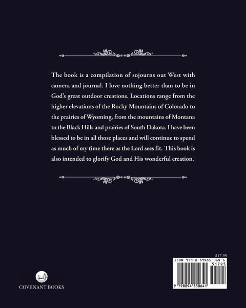 The book is a compilation of sojourns out West with camera and journal. I love nothing better than to be in God's great outdoor creations. Locations range from the higher elevations of the Rocky Mountains of Colorado to the prairies of Wyoming, from the mountains of Montana to the Black Hills and prairies of South Dakota. I have been blessed to be in all those places and will continue to spend as much of my time there as the Lord sees fit. This book is also intended to glorify God and His wonderful creation. 2 2