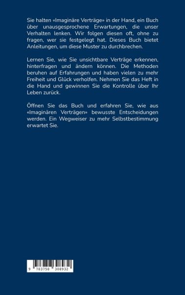 Entdecke "Imaginäre Verträge" und lerne, wie aus deinen unsichtbaren Verpflichtungen bewusste Entscheidungen werden können. "Imaginäre Verträge" ist dein Leitfaden für die Enthüllung unausgesprochener Erwartungen, die unsere Handlungen lenken. Oftmals folgen wir diesen Mustern, ohne uns zu fragen, woher sie stammen. Dieses Buch bietet klare Anleitungen, um diese unsichtbaren Verträge zu identifizieren und zu durchbrechen.Erfahre, wie du diese Muster nicht nur erkennen, sondern auch aktiv hinterfragen und verändern kannst. Die bewährten Methoden basieren auf realen Erfahrungen und haben bereits zahlreichen Menschen zu mehr Freiheit und Glück verholfen. Ergreife die Initiative und gewinne die Kontrolle über dein eigenes Leben zurück!Dieses Buch ist dein Wegweiser zu mehr Selbstbestimmung und einem erfüllten Leben. Übernimm das Steuer und starte deine Reise zu einem befreiten und glücklicheren Ich!