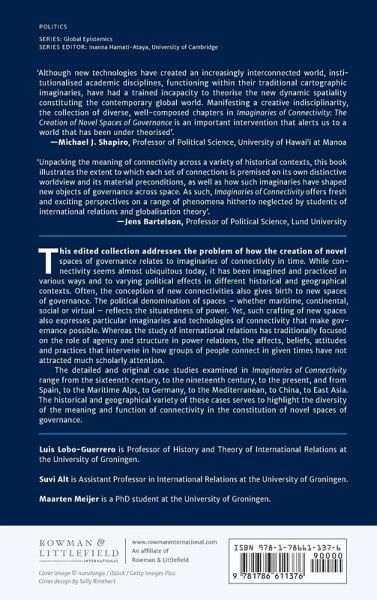This edited collection addresses the problem of how the creation of novel spaces of governance relates to imaginaries of connectivity in time. While connectivity seems almost ubiquitous today, it has been imagined and practiced in various ways and to varying political effects in different historical and geographical contexts. Often the conception of new connectivities also gives birth to new spaces of governance. The political denomination of spaces – whether maritime, continental, social, or virtual – reflects the situatedness of power. Yet, such crafting of new spaces also expresses particular imaginaries and technologies of connectivity that make governance possible. Whereas the study of international relations has traditionally focused on the role of agency and structure in power relations, the affects, beliefs, attitudes, and practices that intervene in how groups of people connect in given times have not attracted much scholarly attention Overall, the detailed and original case studies examined in the book range from the 16th century, to the 19th century, to the present, and from Spain, to the Maritime Alps, to Germany, to the Mediterranean, to China, to East Asia. The historical and geographical variety of the cases serves to highlight the diversity of the meaning and function of connectivity in the constitution of novel spaces of governance.