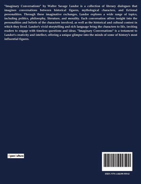 "Imaginary Conversations" by Walter Savage Landor is a collection of literary dialogues that imagines conversations between historical figures, mythological characters, and fictional personalities. Through these imaginative exchanges, Landor explores a wide range of topics, including politics, philosophy, literature, and morality. Each conversation offers insight into the personalities and beliefs of the characters involved, as well as the historical and cultural context in which they lived. Landor's vivid storytelling and rich language bring the characters to life, inviting readers to engage with timeless questions and ideas. "Imaginary Conversations" is a testament to Landor's creativity and intellect, offering a unique glimpse into the minds of some of history's most influential figures.
