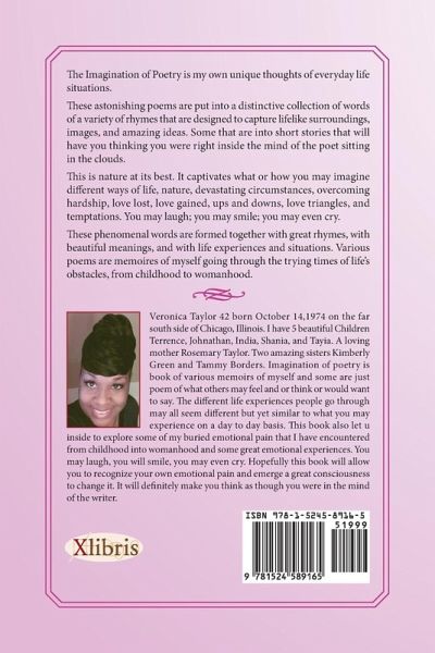 The Imagination of Poetry is my own unique thoughts of everyday life situations. These astonishing poems are put into a distinctive collection of words of a variety of rhymes that are designed to capture lifelike surroundings, images, and amazing ideas. Some that are into short stories that will have you thinking you were right inside the mind of the poet sitting in the clouds. This is nature at its best. It captivates what or how you may imagine different ways of life, nature, devastating circumstances, overcoming hardship, love lost, love gained, ups and downs, love triangles, and temptations. You may laugh; you may smile; you may even cry. These phenomenal words are formed together with great rhymes, with beautiful meanings, and with life experiences and situations. Various poems are memoires of myself going through the trying times of life's obstacles, from childhood to womanhood.