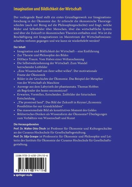 Der vorliegende Band stellt ein erstes Grundlagenwerk zur Imaginationsforschung in der Ökonomie dar. Er erforscht die ökonomische Theoriegeschichte (auch mit Bezug auf die Philosophiegeschichte) und fragt, welche Bilder und Selbstbilder über Menschen, über das wirtschaftliche System und über die Zukunft in ökonomischen Theorien enthalten sind. Wie ist die Beschäftigung mit Imaginationen im Mainstream der Wirtschaftswissenschaften verloren gegangen und wie kann sie wiederbelebt werden?