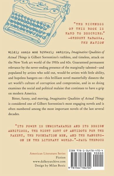 Wildly comic and bitterly satiric, Imaginative Qualities of Actual Things is Gilbert Sorrentino's ruthless, and timeless, attack on the New York art world of the 1950s and '60s. Guaranteed permanent relevance by the never-ending presence of the marginally talented--and populated by artists who sold out, would-be artists with little ability, and hopeless hangers-on--this brilliant novel masterfully dissects the art world's culture of corruption and compromise, and in so doing examines the social and political malaise that continues to have a grip on modern America. One of Gilbert Sorrentino's most engaging novels, Imaginative Qualities of Actual Things is often named among the most important novels of the last several decades.