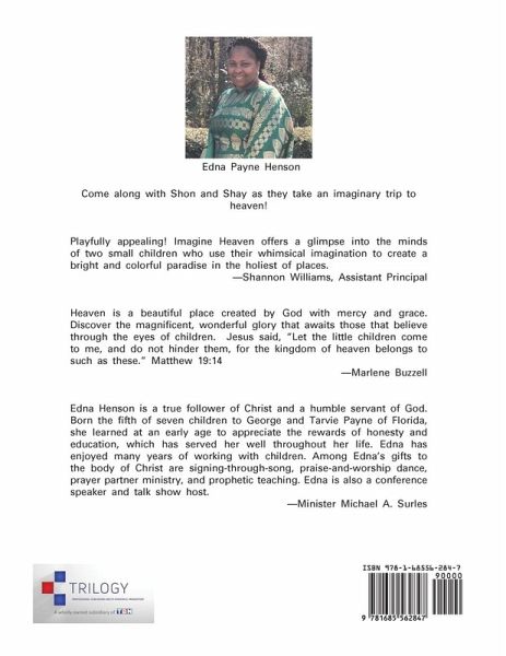 Come along with Shon and Shay as they take an imaginary trip to heaven! Playfully appealing! Imagine Heaven offers a glimpse into the minds of two small children who use their whimsical imagination to create a bright and colorful paradise in the holiest of places. -Shannon Williams, Assistant Principal Heaven is a beautiful place created by God with mercy and grace. Discover the magnificent, wonderful glory that awaits those that believe through the eyes of children. Jesus said, "Let the little children come to me, and do not hinder them, for the kingdom of heaven belongs to such as these." Matthew 19:14 -Marlene Buzzell