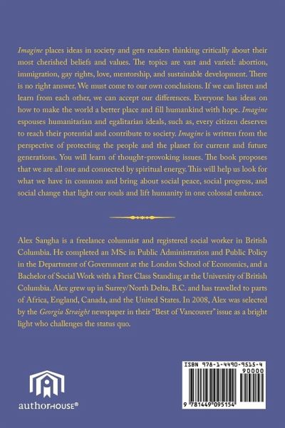 Imagine places ideas in society and gets readers thinking critically about their most cherished beliefs and values. The topics are vast and varied. Abortion, immigration, gay rights, love, mentorship, and sustainable development. There is no right answer. We must come to our own conclusions. If we can listen and learn from each other, we can accept our differences. Everyone has ideas on how to make the world a better place and fill humankind with hope. Imagine espouses humanitarian and egalitarian ideals such as every citizen deserves to reach their potential and contribute to society. Imagine is written from the perspective of protecting the people and the planet for current and future generations. You will learn of thought-provoking issues. The book proposes that we are all one and connected by spiritual energy. This will help us look for what we have in common and bring about social peace, social progress, and social change that lights our soul and lifts humanity in one colossal embrace.