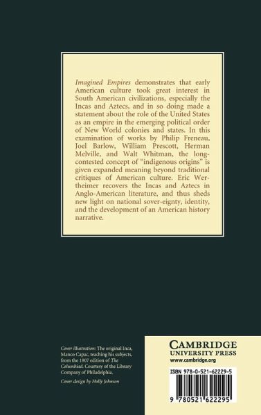 Imagined Empires, first published in 1999, demonstrates that early American culture, and in particular literature, took great interest in South American civilisations, especially the Incas and Aztecs, and in so doing made a statement about the role of the United States as an empire in the emerging political order of New World colonies and states. By examining the work of Philip Freneau, Joel Barlow, William Prescott, Herman Melville, and Walt Whitman, the long-contested concept of 'indigenous origins' is given expanded meaning beyond traditional critiques of American culture. Eric Wertheimer recovers the Incas and Aztecs in Anglo-American literature, and thus sheds new light on national sovereignty, identity and the development of an American history narrative.