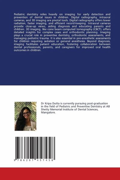 Pediatric dentistry relies heavily on imaging for early detection and prevention of dental issues in children. Digital radiography, intraoral cameras, and 3D imaging are pivotal tools. Digital radiography offers lower radiation, faster imaging, and efficient record-keeping. Intraoral cameras provide close-up views, aiding diagnosis and educating parents and children. 3D imaging, like cone beam computed tomography (CBCT), offers detailed insights for complex cases and orthodontic planning. Imaging plays a crucial role in preventive dentistry, orthodontic assessments, and managing pediatric trauma. It is also essential in pre-anesthetic assessments for children requiring sedation or general anesthesia. Beyond diagnosis, imaging facilitates patient education, fostering collaboration between dental professionals, parents, and caregivers for improved oral health outcomes in children.
