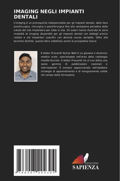 L'imaging è un prerequisito indispensabile per gli impianti dentali, dalla fase prechirurgica, chirurgica e postchirurgica fino alla valutazione periodica della salute del sito implantare per tutta la vita. Gli autori hanno illustrato le varie modalità di imaging disponibili per gli impianti dentali con dettagli precisi relativi a siti implantari specifici con densità ossea variabile. Oltre alle tecniche distinte, questo libro sottolinea anche le prospettive future.