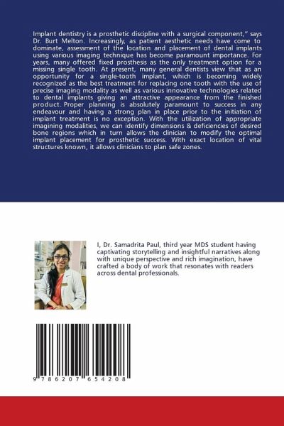 Implant dentistry is a prosthetic discipline with a surgical component," says Dr. Burt Melton. Increasingly, as patient aesthetic needs have come to dominate, assessment of the location and placement of dental implants using various imaging technique has become paramount importance. For years, many offered fixed prosthesis as the only treatment option for a missing single tooth. At present, many general dentists view that as an opportunity for a single-tooth implant, which is becoming widely recognized as the best treatment for replacing one tooth with the use of precise imaging modality as well as various innovative technologies related to dental implants giving an attractive appearance from the finished product. Proper planning is absolutely paramount to success in any endeavour and having a strong plan in place prior to the initiation of implant treatment is no exception. With the utilization of appropriate imagining modalities, we can identify dimensions & deficiencies of desired bone regions which in turn allows the clinician to modify the optimal implant placement for prosthetic success. With exact location of vital structures known, it allows clinicians to plan safe zones.