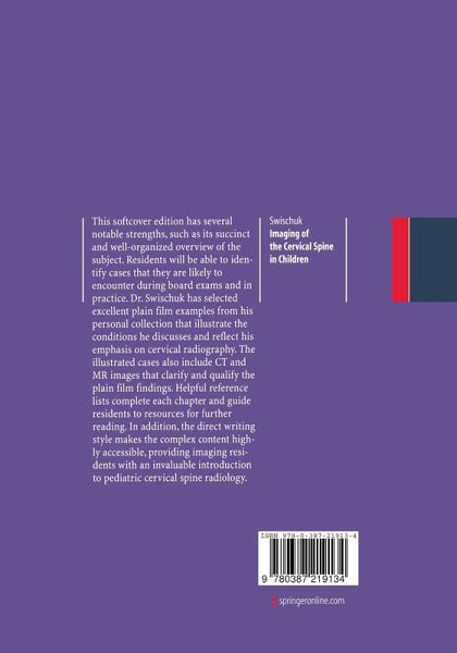 The book has several strengths that appeal to radiology residents, such as its succinct overview of the topic and helpful reference lists that guide readers to additional resources. Dr. Swischuk illustrates conditions he discusses with excellent plain film examples that help residents identify cases they are likely to encounter during board exams and in practice. Accompanying CT and MR images clarify and qualify the findings. Dr. Swischuk's direct writing style makes the complex content highly accessible, providing imaging residents with an invaluable introduction to pediatric cervical spine radiology.