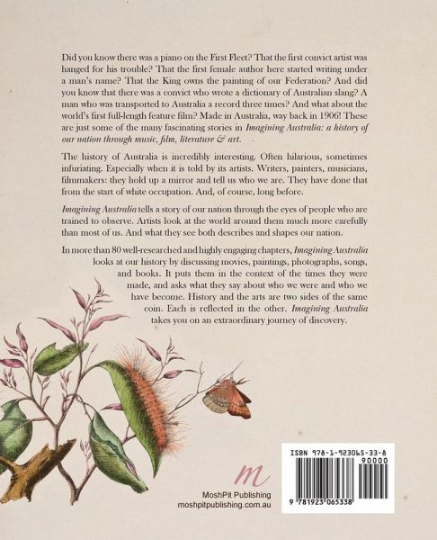 Did you know there was a piano on the First Fleet? That the first convict artist was hanged for his trouble? That the first female author here started writing under a man's name? That the King owns the painting of our Federation? And did you know that there was a convict who wrote a dictionary of Australian slang? A man who was transported to Australia a record three times? And what about the world's first full-length feature film? Made in Australia, way back in 1906! These are just some of the many fascinating stories in Imagining Australia: a history of our nation through music, film, literature & art. The history of Australia is incredibly interesting. Often hilarious, sometimes infuriating. Especially when it is told by its artists. Writers, painters, musicians, filmmakers: they hold up a mirror and tell us who we are. They have done that from the start of white occupation. And, of course, long before. Imagining Australia tells a story of our nation through the eyes of people who are trained to see. Artists look at the world around them much more carefully than most of us. And what they see both describes and shapes our nation. In more than 80 well-researched and highly engaging chapters, Imagining Australia looks at our history by discussing movies, paintings, photographs, songs, and books. It puts them in the context of the times they were made, and asks what they say about who we were and who we have become. History and the arts are two sides of the same coin. Each is reflected in the other. Imagining Australia takes you on an extraordinary journey of discovery.
