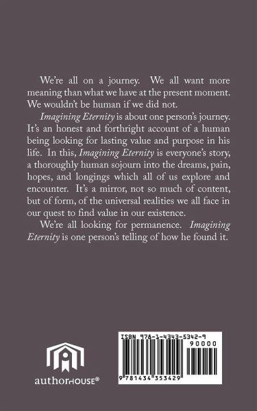 We're all on a journey. We all want more meaning than what we have at the present moment. We wouldn't be human if we did not. Imagining Eternity is about one person's journey. It's an honest and forthright account of a human being looking for lasting value and purpose in his life. In this, Imagining Eternity is everyone's story, a thoroughly human sojourn into the dreams, pain, hopes, and longings which all of us explore and encounter. It's a mirror, not so much of content, but of form, of the universal realities we all face in our quest to find value in our existence. We're all looking for permanence. Imagining Eternity is one person's telling of how he found it.