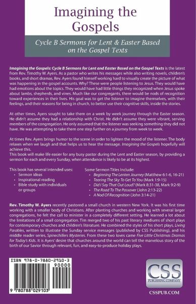 Imagining the Gospels: Cycle B Sermons for Lent and Easter Based on the Gospel Texts is the latest from Rev. Timothy W. Ayers. As a pastor who writes his messages while also writing novels, children's books, and short dramas, Rev. Ayers found himself working hard to visually create the picture of what was happening in the gospel accounts. Why? These were people listening to Jesus. They would have had emotions about the topics. They would have had little things they recognized when Jesus spoke about lambs, shepherds, and vines. Much like our congregants, there would be nods of recognition toward experiences in their lives. His goal was to get the listener to imagine themselves, with their feelings, and their reasons for being in church, to better use their cognitive skills, inside the stories. At other times, Ayers sought to take them on a week by week journey through the Easter season. He didn't assume they have a relationship with Christ. He didn't assume they are vibrant, serving members of the congregation. He only assumed that the listener is seeking something they do not have. He was attempting to take them one step further on a journey from week to week. At times Rev. Ayers brings humor to the scene in order to lighten the mood of the listener. The body relaxes when we laugh and that helps us to hear the message. Imagining the Gospels hopefully will achieve this. This book will make life easier for any busy pastor during the Lent and Easter season, by providing a sermon for each and every Sunday, when attendance is likely to be at its highest. This book has several intended uses: Sermon ideas Inspirational reading Bible study with individuals or groups Some Sermon Titles Include: Beginning The Lenten Journey (Matthew 6:1-6, 16-21) Tearing The Sky To Get To You (Mark 1:9-15) Did I Say That Out Loud? (Mark 8:31-38, Mark 9:2-9) The Road To The Passover (John 2:13-22) A Nod Of Recognition (John 3:14-21) Rev. Timothy W. Ayers recently pastored a small church in western New York. It was his first time working with a smaller body of Christians. After planting churches and working with several larger congregations, he felt the call to minister in a completely different setting. He learned a lot about the limitations of a small congregation. Tim merged two of his past literary mediums of short plays for contemporary churches and children's literature. He combined the styles of his short plays, Living Parables, written to illustrate the Sunday service messages (published by CSS Publishing), and his middle reader series, Spinechillers Mysteries. From these two loves came Five Little Christmas Dramas for Today's Kids. It is Ayers' desire that churches around the world can tell this marvelous story of the birth of our Savior through relevant, fun, and easy-to-produce holiday plays.