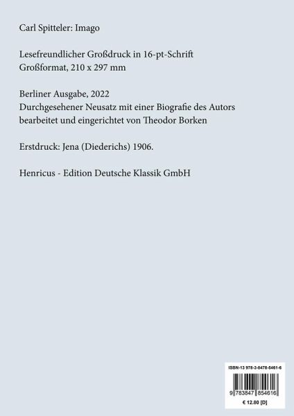 Carl Spitteler: ImagoLesefreundlicher Großdruck in 16-pt-SchriftGroßformat, 210 x 297 mmBerliner Ausgabe, 2023Durchgesehener Neusatz mit einer Biografie des Autors bearbeitet und eingerichtet von Theodor BorkenErstdruck: Jena (Diederichs) 1906.Textgrundlage ist die Ausgabe:Carl Spitteler: Gesammelte Werke. Herausgegeben von Gottfried Bohnenblust, Wilhelm Altweg und Robert Faesi. Mit einem Geleitwort von Bundesrat Philipp Etter, 9 Bände und 2 Geleitbände, Zürich: Artemis, 1945-1958.Umschlagabbildung: Lawrence Alma-Tadema, Summer offering, 1911Gesetzt aus der Minion Pro, 16 pt.Henricus - Edition Deutsche Klassik GmbHÜber den Autor:1845 als Sohn eines liberalen Politikers in Liestal in der Schweiz geboren, beginnt Spitteler zunächst ein Jurastudium in Basel und studiert ab 1865 Theologie in Heidelberg, Zürich und Basel. 1870 tritt er die Stelle eines Erziehers im Haus eines russischen Generals in St. Petersburg an. Neun Jahre später kehrt er in die Schweiz zurück und arbeitet als Lehrer bis er 1885 Redakteur der »Neuen Züricher Zeitung« wird. Erst mit seinem Epos »Olympischer Frühling« stellt sich 1905 die gewünschte Anerkennung seines literarischen Schaffens ein. 1914 spricht er sich für die Neutralität der Schweiz und gegen die Vereinnahmung seines Werkes durch den deutschen Nationalismus aus. 1920 erhält er rückwirkend für 1919 den Nobelpreis für Literatur. Am 29. Dezember 1924 stirbt Carl Spitteler in Luzern.