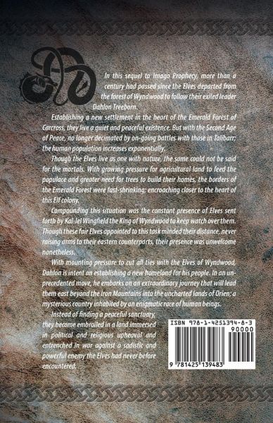 In this sequel to Imago Prophecy more than a century had passed since the Elves departed from the forest of Wyndwood to follow their exiled leader, Dahlon Treeborn. Embarking on an extraordinary journey, he leads them east beyond the Iron Mountains into Orien; a mysterious country inhabited by an enigmatic race of human beings.