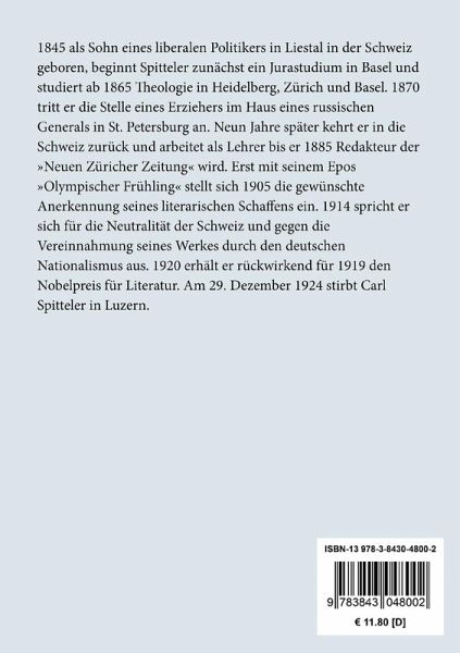 1845 als Sohn eines liberalen Politikers in Liestal in der Schweiz geboren, beginnt Spitteler zunächst ein Jurastudium in Basel und studiert ab 1865 Theologie in Heidelberg, Zürich und Basel. 1870 tritt er die Stelle eines Erziehers im Haus eines russischen Generals in St. Petersburg an. Neun Jahre später kehrt er in die Schweiz zurück und arbeitet als Lehrer bis er 1885 Redakteur der "Neuen Züricher Zeitung" wird. Erst mit seinem Epos "Olympischer Frühling" stellt sich 1905 die gewünschte Anerkennung seines literarischen Schaffens ein. 1914 spricht er sich für die Neutralität der Schweiz und gegen die Vereinnahmung seines Werkes durch den deutschen Nationalismus aus. 1920 erhält er rückwirkend für 1919 den Nobelpreis für Literatur. Am 29. Dezember 1924 stirbt Carl Spitteler in Luzern.