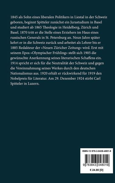 1845 als Sohn eines liberalen Politikers in Liestal in der Schweiz geboren, beginnt Spitteler zunächst ein Jurastudium in Basel und studiert ab 1865 Theologie in Heidelberg, Zürich und Basel. 1870 tritt er die Stelle eines Erziehers im Haus eines russischen Generals in St. Petersburg an. Neun Jahre später kehrt er in die Schweiz zurück und arbeitet als Lehrer bis er 1885 Redakteur der "Neuen Züricher Zeitung" wird. Erst mit seinem Epos "Olympischer Frühling" stellt sich 1905 die gewünschte Anerkennung seines literarischen Schaffens ein. 1914 spricht er sich für die Neutralität der Schweiz und gegen die Vereinnahmung seines Werkes durch den deutschen Nationalismus aus. 1920 erhält er rückwirkend für 1919 den Nobelpreis für Literatur. Am 29. Dezember 1924 stirbt Carl Spitteler in Luzern.
